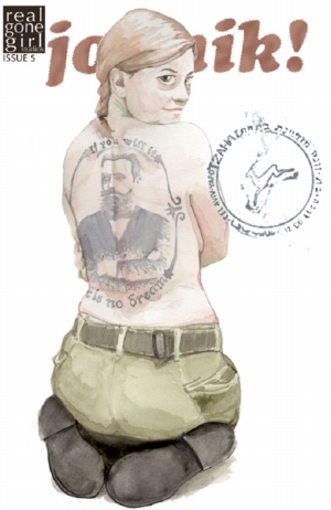 The interweaving of Zionism with sexuality becomes especially clear on the cover of Jobnik!’s fifth issue where a topless Miriam provocatively displays a tattoo of Theodore Herzl on her back, his classically austere pose with arms folded circled by calligraphy of his most famous maxim: “If you will it, it is no dream.” Looking over her shoulder with doe-like eyes and a coy grin, the reader finds Miriam’s arms folded across her breasts in a show of playful pseudo-modesty. Meanwhile, she dons combat boots and khaki pants.